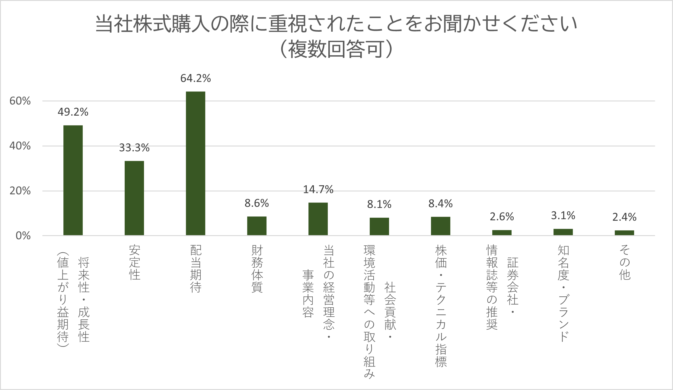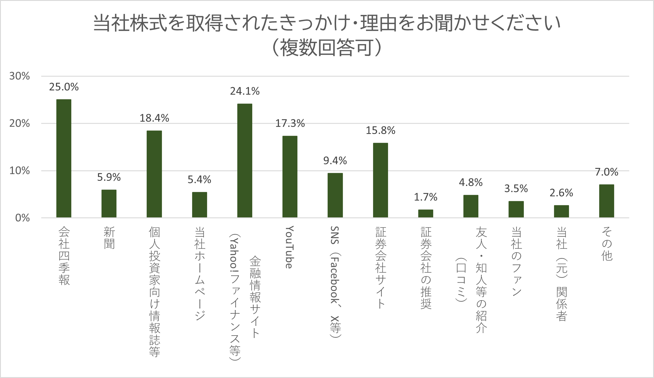 会社四季報や金融情報サイトを参考に当社株式を取得された株主さまが多い結果となりました。今後も投資家の皆さまに分かりやすい情報提供の充実に努めてまいります。