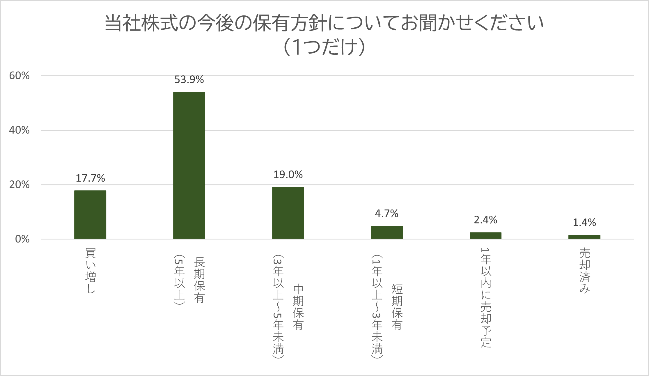当社株式を長期保有とお考えの株主さまが50%以上の結果となりました。いただいた期待に応えるべく、当社事業の長期的な発展に資する取り組みを進めてまいります。