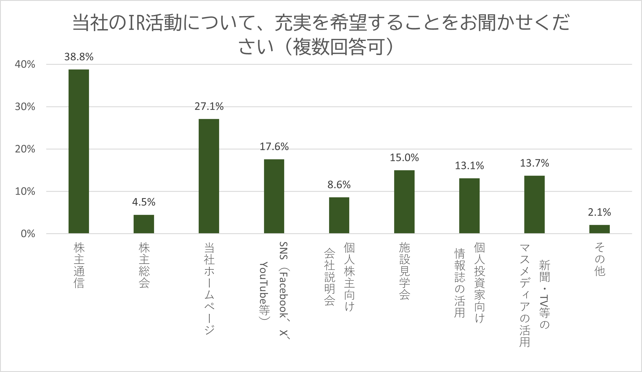 当社に希望するIR活動としては、株主通信がもっとも高い結果となりました。当社事業へのご理解をさらに深めていただくべく、内容を充実させた株主通信の制作に取り組んでまいります。
